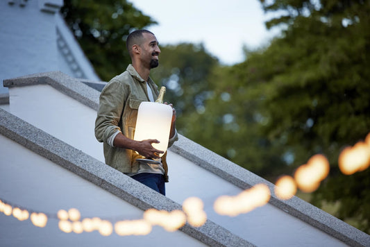 The Kooduu Atmos combines the luxury of a lamp, the convenience of a drink holder, and the pleasure of a Bluetooth speaker in one chic cylindrical design. The Atmos is available in 2 versions with a premium steel or brass stand. Designed by legendary Jacob Jensen Design Studio in Denmark.